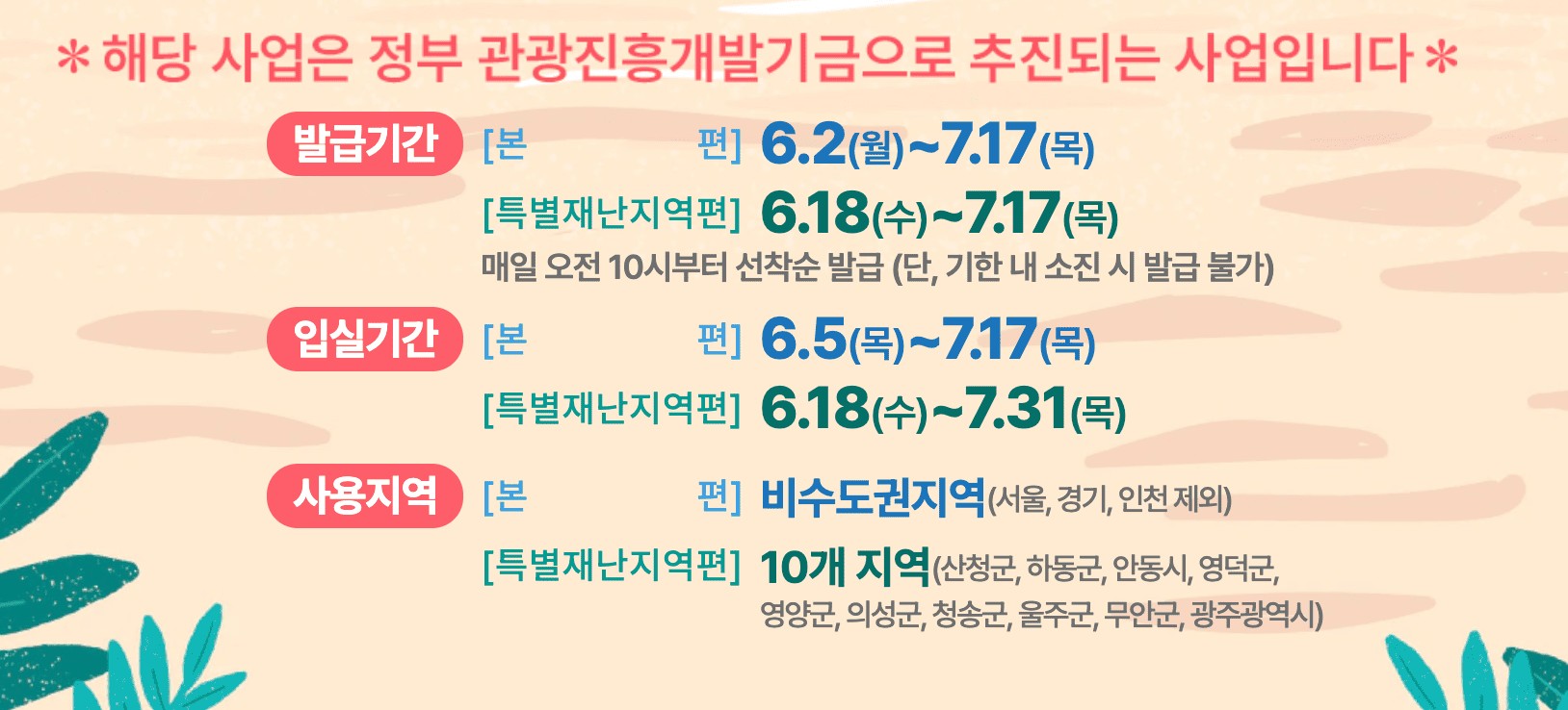 문화체육관광부와 한국관광공사가 주관하는 ‘여름맞이 숙박세일 페스타’는 숙박 할인 쿠폰을 제공하여 국내여행 수요를 촉진하는 정부 주도 프로젝트입니다. 지역경제 활성화는 물론, 산불 등 재난으로 어려움을 겪은 지역에 여행객을 유도하는 의미도 담고 있습니다.