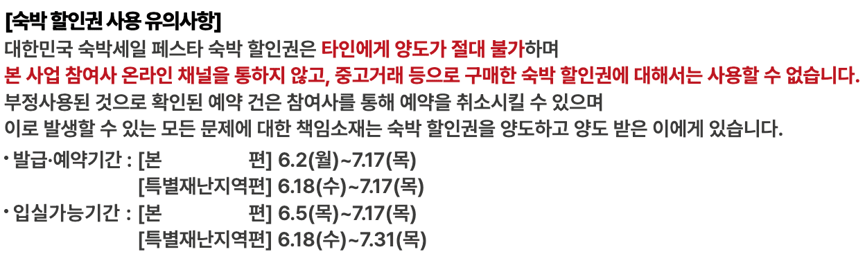 무더운 여름이 시작되는 6월, 국내여행을 계획 중이라면 반드시 확인해야 할 ‘여름맞이 숙박세일 페스타’가 돌아왔습니다! 숙박비 최대 5만원 할인은 물론, 특별재난지역 전용 할인까지 마련되어 있어 실속 있는 여행을 준비하는 분들께 큰 도움이 될 이벤트입니다.
