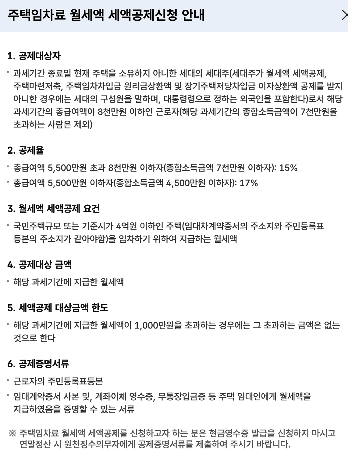 - 월세를 지불하는 세입자가 연말정산 또는 종합소득세 신고 시 세액공제 혜택을 받을 수 있음